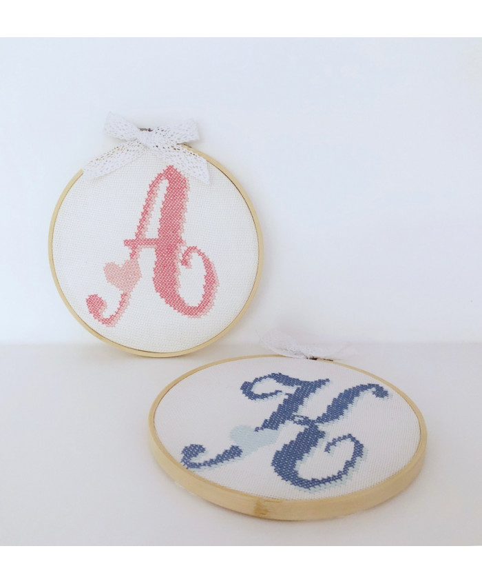 Χειροποίητο κεντημένο διακοσμητικό καδράκι διαμέτρου 17 εκ, με κεντημένο το μονόγραμμα που επιθυμείτε σε βαμβακερό ύφασμα εταμίν κεντημένο με μουλινέ dmc στην απόχρωση που επιθυμείτε.