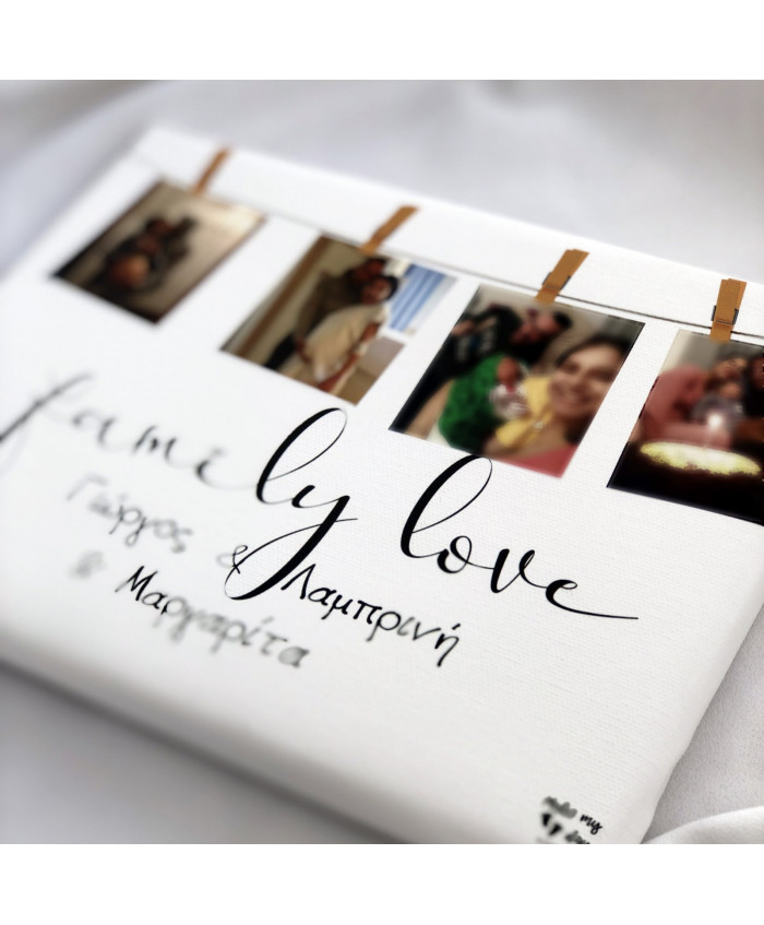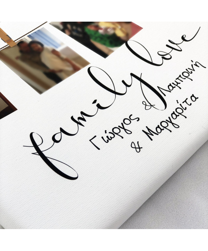 Προσωποποιημένο τυπωμένο καδράκι με φωτογραφίες και τα ονόματα της οικογένειάς σας, διαστάσεων 18x24 εκ, τυπωμένο σε καμβά και τελαρωμένο σε καδράκι.