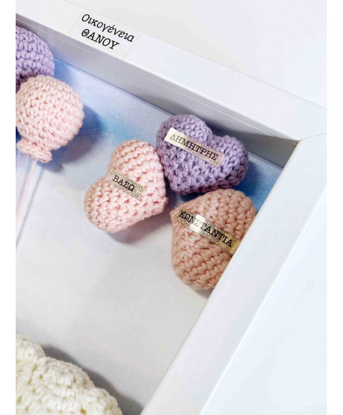 Χειροποίητο πλεκτό προσωποποιημένο οικογενειακό καδράκι με τα ονόματα των μελών και το επίθετο της οικογένειάς σας σε απόχρωση του μωβ και του ροζ. Διάσταση 25x25 εκ με 3 πλεκτά ελεφαντάκια, πλεκτά μπαλόνια και πλεκτές καρδιές με τα ονόματα των μελών της οικογένειας σε δερματίνη.