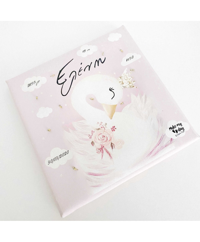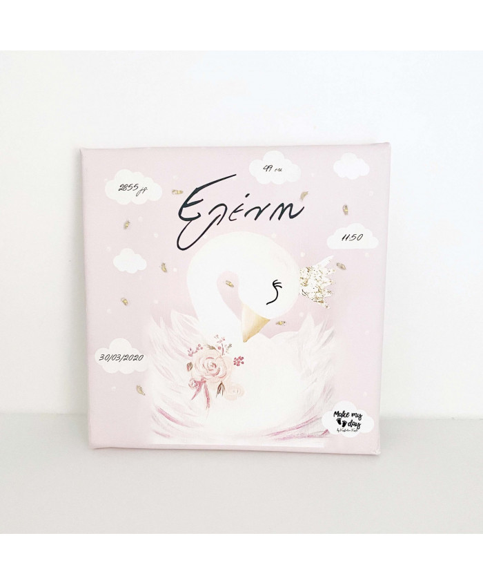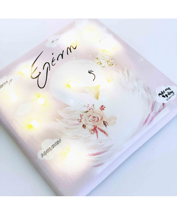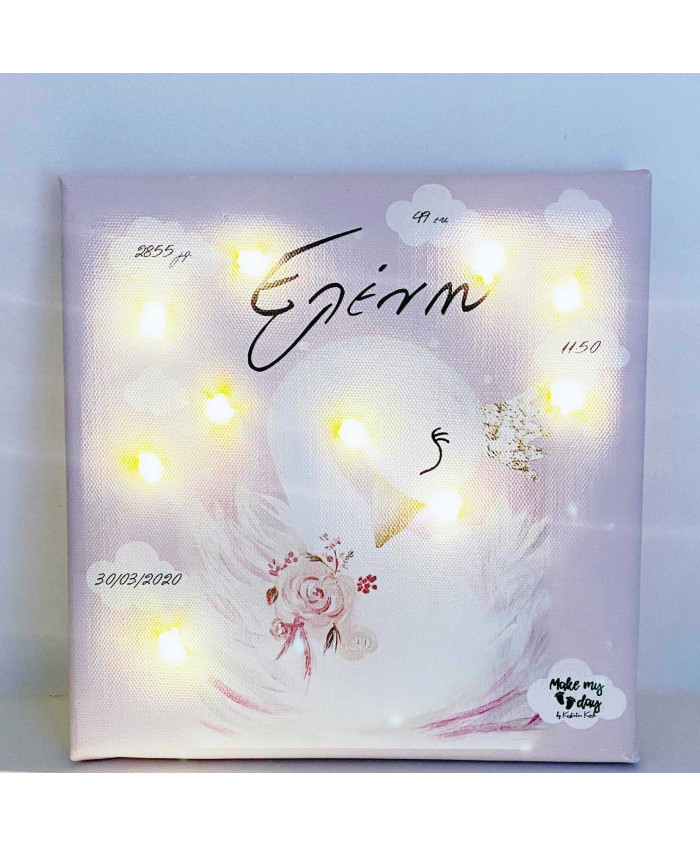 Προσωποποιημένο τυπωμένο καδράκι με τα στοιχεία γέννησης του παιδιού σας κύκνο σε παστέλ ροζ αποχρώσεις, διαστάσεων 20x20 εκ, τυπωμένο σε καμβά και τελαρωμένο σε καδράκι και 10 led λαμπάκια μπαταρίας, με λευκό φως για να λειτουργεί και ως φωτάκι ύπνου για το δωμάτιό σας.