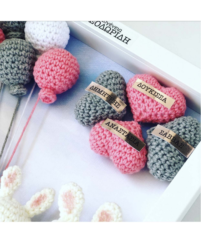Χειροποίητο πλεκτό προσωποποιημένο οικογενειακό καδράκι με τα ονόματα των μελών και το επίθετο της οικογένειάς σας σε αποχρώσεις γκρι-ροζ. Διάσταση 25x25 εκ με 4 πλεκτά λαγουδάκια, πλεκτά μπαλόνια και πλεκτές καρδιές με τα ονόματα των μελών της οικογένειας σε δερματίνη.Ένα εντυπωσιακό δώρο για γέννηση, βάπτιση και γενέθλια...