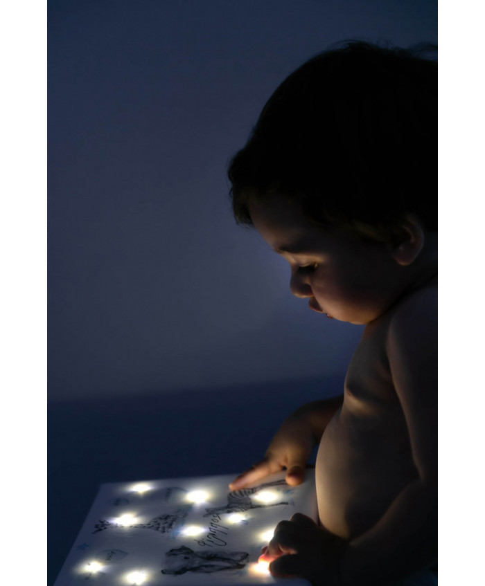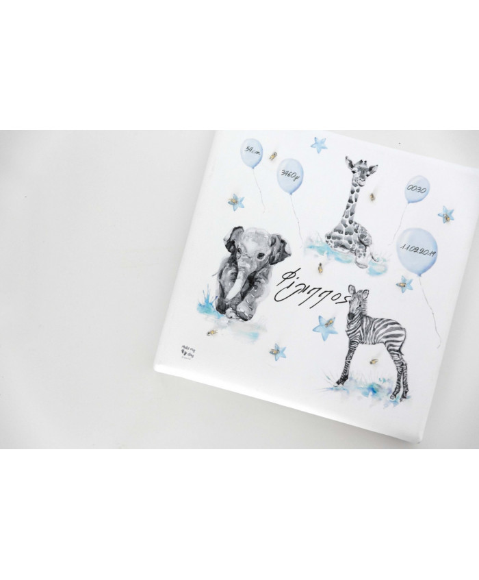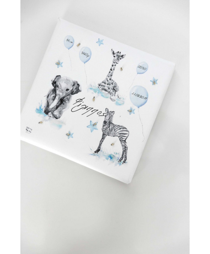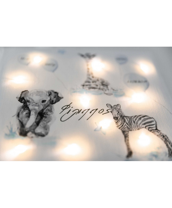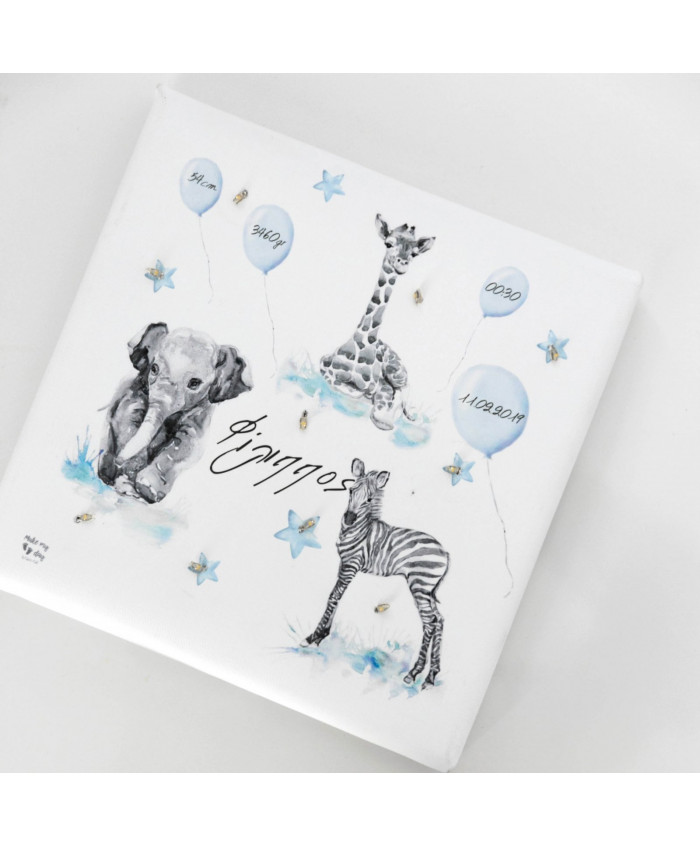 Προσωποποιημένο τυπωμένο καδράκι με τα στοιχεία γέννησης του παιδιού σας και ζωάκια του δάοσυς σε παστέλ σιέλ αποχρώσεις, διαστάσεων 20x20 εκ, τυπωμένο σε καμβά και τελαρωμένο σε καδράκι και 10 led λαμπάκια μπαταρίας, με λευκό φως για να λειτουργεί και ως φωτάκι ύπνου για το δωμάτιό σας.