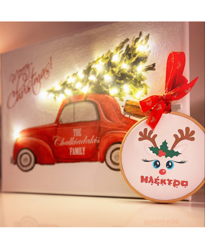 Χριστουγεννιάτικο στολίδι για το δέντρο σας, σε τελαράκι διαμέτρου 10 εκ, με τυπωμένο σε ύφασμα το ταρανδάκι κοριτσάκι και το όνομα του παιδιού σας.