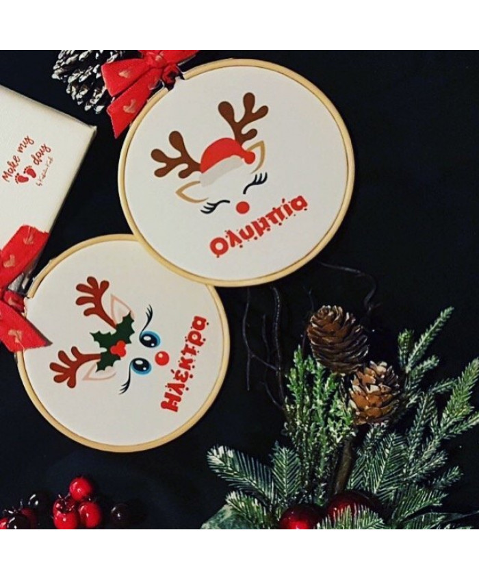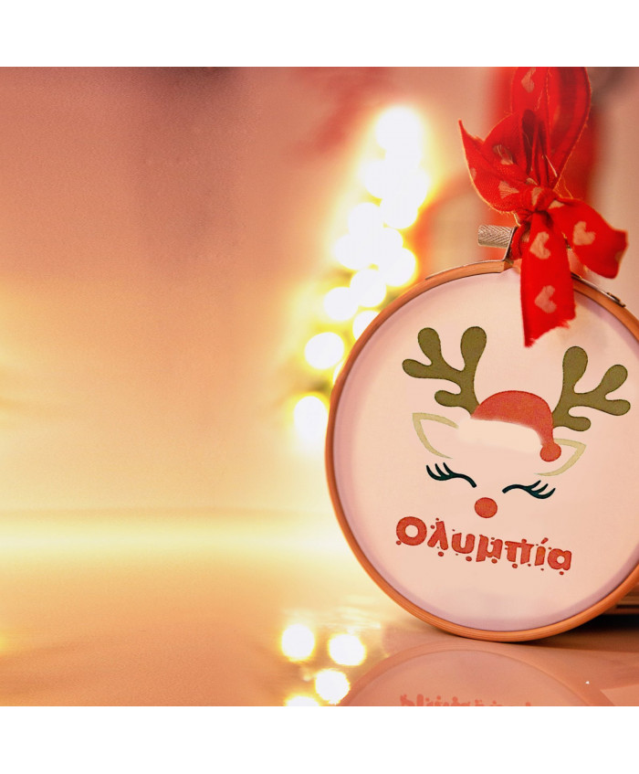 Χριστουγεννιάτικο στολίδι για το δέντρο σας, σε τελαράκι διαμέτρου 10 εκ, με τυπωμένο σε ύφασμα το ταρανδάκι με σκούφο χριστουγενννιάτικο και το όνομα του παιδιού σας.