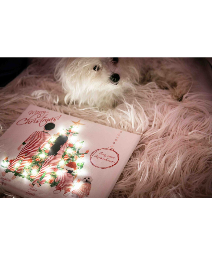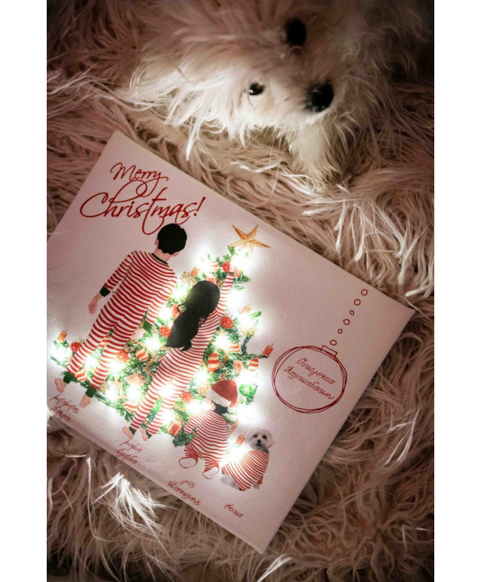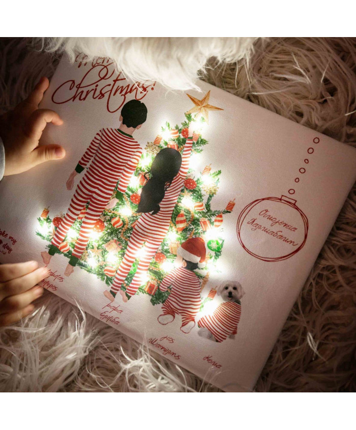 Christmas family καδράκι προσωποποιημένο με το επίθετο της οικογένειάς σας και τα μέλη της, τυπωμένο σε καμβά διαστάσεων 24x30 εκ, με 20 λαμπάκια led με μπαταρίες (οι μπαταρίες συμπεριλαμβάνονται).
