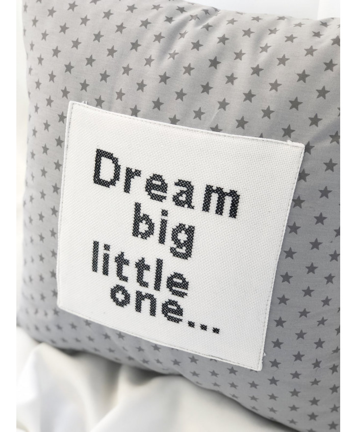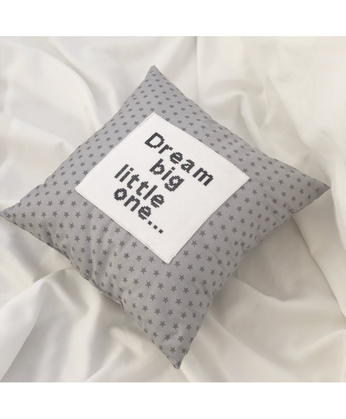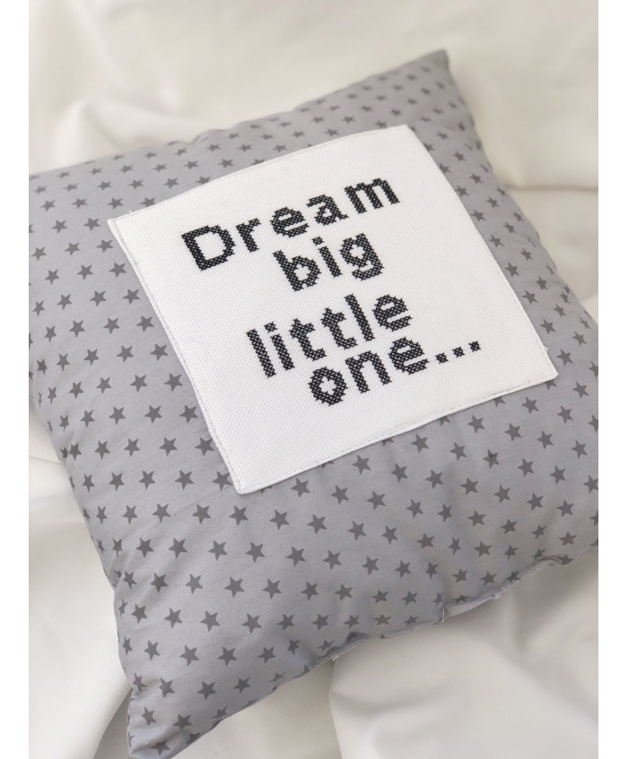 Χειροποίητο κεντημένο διακοσμητικό μαξιλαράκι διαστάσεων 40x40 εκ, με κεντημένο «Dream big little one…” σε βαμβακερό ύφασμα εταμίν κεντημένο με μουλινέ dmc και πλαισιωμένο από βαμβακερό ύφασμα με γκρι αστεράκια