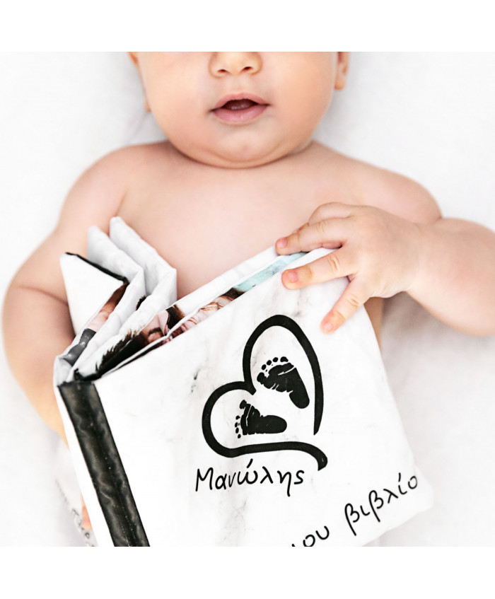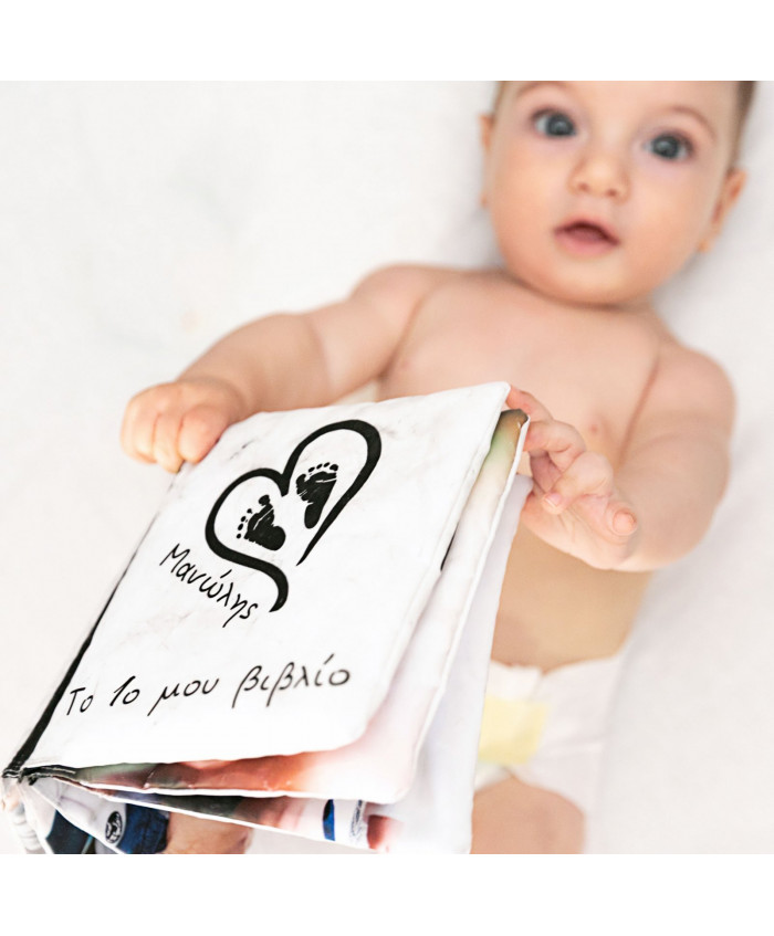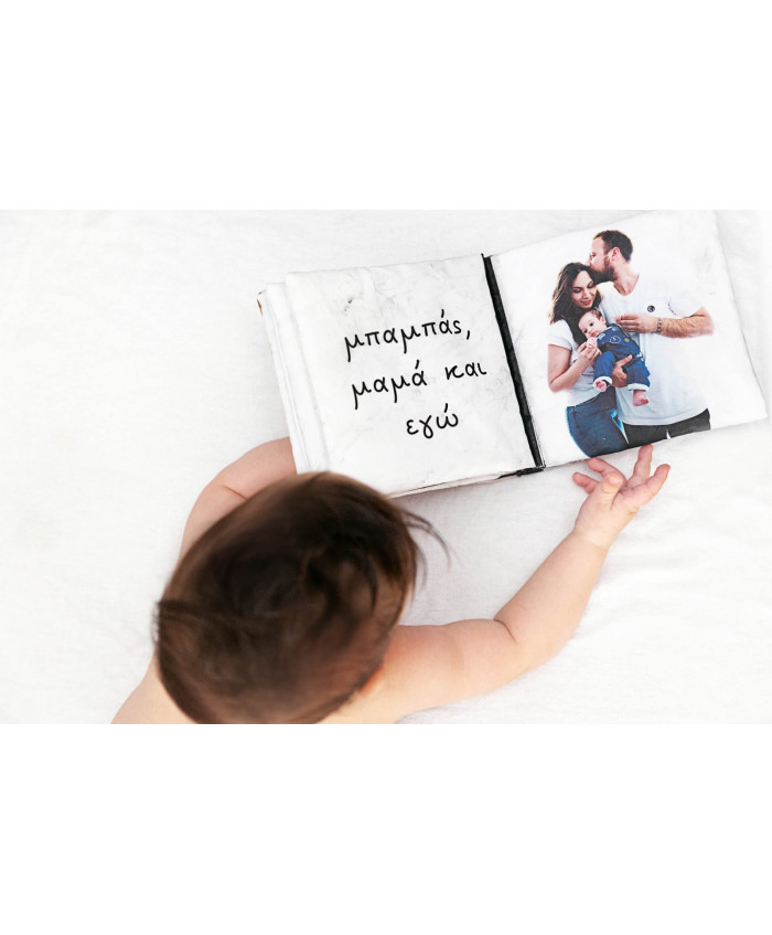 Το πρώτο βιβλίο του μωρού σας. Ένα μαλακό υφασμάτινο βιβλίο σχεδιασμένο ειδικά για το κάθε παιδάκι, με φωτογραφίες του μωρού σας και της οικογένειάς σας, διαστάσεων 15x15 εκ κλειστό και15x32 εκ ανοικτό. Τυπωμένο σε εκτυπωτή με υδατοδιαλυτά μελάνια Pigment. Διασκεδαστικό στο ξεφύλλισμα και βολικό στο κράτημα από το μωρό. Το μαλακό προσωποποιημένο βιβλίο του μωρού σας κρύβει μία νέα έκπληξη σε κάθε του σελίδα. Το μωράκι σας χαζεύει φωτογραφίες δικές του και με τους γονείς του. Το βιβλίο αποτελείται από 10 φύλλα με 5 διαφορετικές φωτογραφίες...