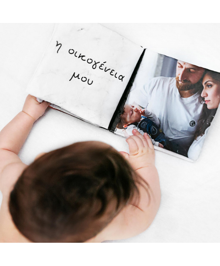 Το πρώτο βιβλίο του μωρού σας. Ένα μαλακό υφασμάτινο βιβλίο σχεδιασμένο ειδικά για το κάθε παιδάκι, με φωτογραφίες του μωρού σας και της οικογένειάς σας, διαστάσεων 15x15 εκ κλειστό και15x32 εκ ανοικτό. Τυπωμένο σε εκτυπωτή με υδατοδιαλυτά μελάνια Pigment. Διασκεδαστικό στο ξεφύλλισμα και βολικό στο κράτημα από το μωρό. Το μαλακό προσωποποιημένο βιβλίο του μωρού σας κρύβει μία νέα έκπληξη σε κάθε του σελίδα. Το μωράκι σας χαζεύει φωτογραφίες δικές του και με τους γονείς του. Το βιβλίο αποτελείται από 10 φύλλα με 5 διαφορετικές φωτογραφίες.