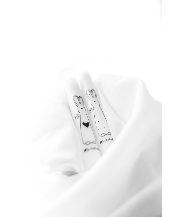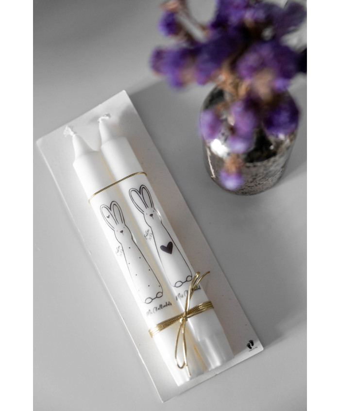 Δημιουργήσαμε το πιο cute σετ λαμπάδων για εσένα και το ταίρι σου. Προσωποποιημένη με τυπωμένο το όνομα του καθενός και το γλυκό λαγουδάκι με το έτος της Ανάστασης. Το κάθε σετ περιλαμβάνει δύο κεριά διαστάσεων 20 εκ η καθεμία και δεμένες μεταξύ  τους σε χαρτονένια βάση.