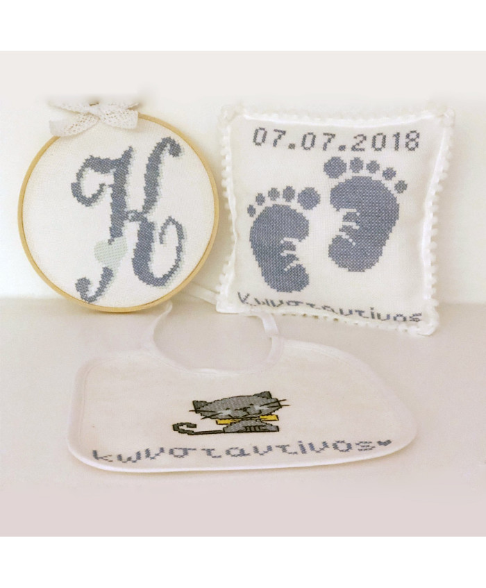 Το βρεφικό σετ δώρου περιλαμβάνει μία σαλιάρα γατούλα με κεντημένο το όνομα του μωρού σας, ένα διακοσμητικό μαξιλαράκι πατουσάκια με κεντημένο το όνομα και ημερομηνία γέννησης του μωρού διαστάσεων 20x20εκ και ένα κεντημένο τελαράκι διαμέτρου 17 εκ με το μονόγραμμα του μωρού σας.