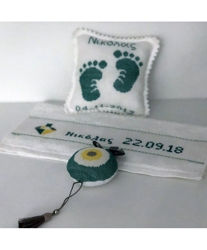 Το σετ δώρου περιλαμβάνει ένα διακοσμητικό μαξιλαράκι πατουσάκια με κεντημένο το όνομα και ημερομηνία γέννησης του μωρού διαστάσεων 20x20εκ ,ένα κεντημένο ματάκι γούρι διαμέτρου 9 εκ και μία πετσέτα προσώπου με κεντημένη το όνομα και ημερομηνία γέννησης του μωρού του μωρού.. Ένα προσωποποιημένο δώρο για τη γέννηση ή τη βάπτιση του μωρού.
