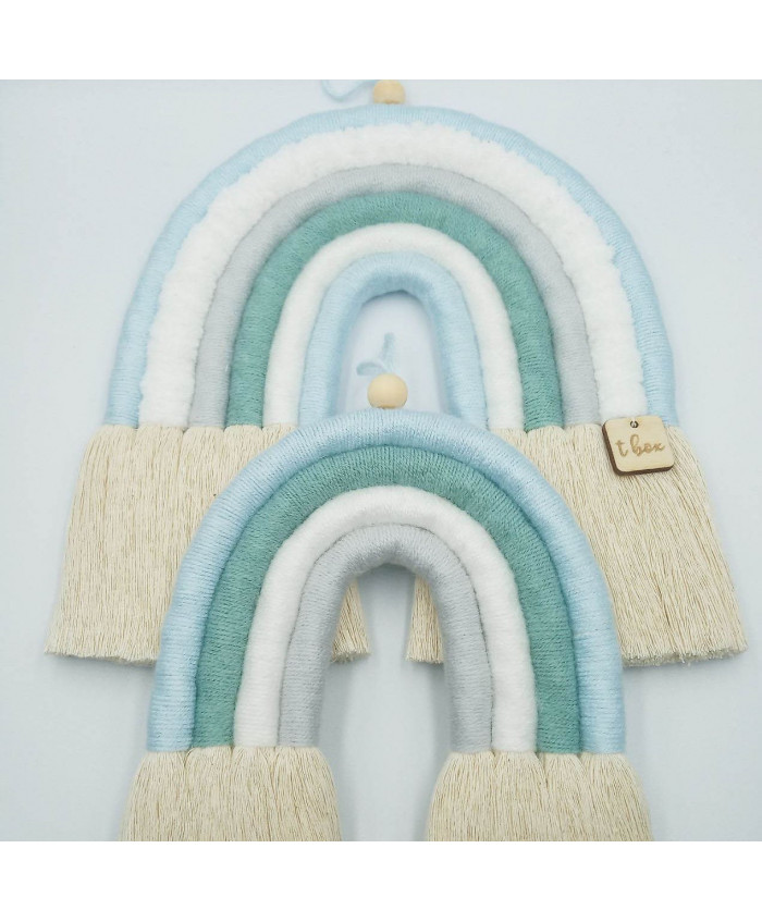 Set με Macrame rainbow σε μεντα - σιέλ αποχρώσεις, φτιαγμένο όλο στο χέρι με κορδόνι από 100%  ανακυκλωμένο οργανικό βαμβάκι και τυλιγμένο με υποαλλεργικά βρεφικά νήματα για την διακόσμηση του παιδικού σας δωματίου.