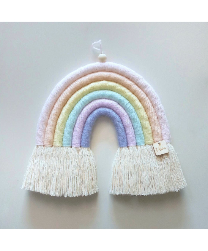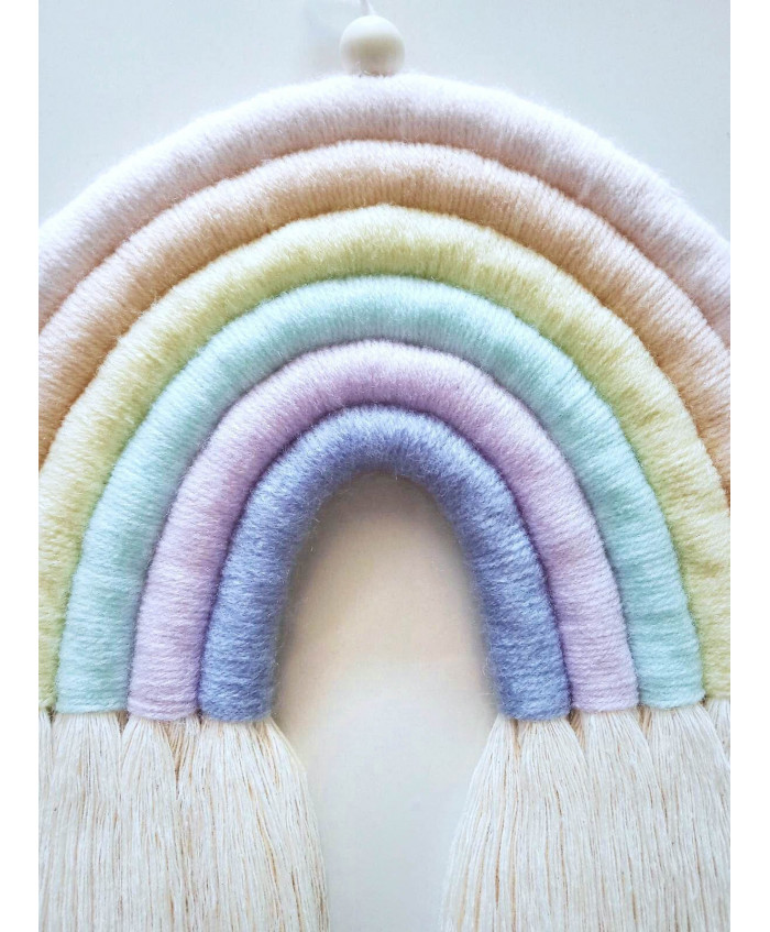 Macrame rainbow σε παστέλ αποχρώσεις, φτιαγμένο όλο στο χέρι με κορδόνι από 100% ανακυκλωμένο οργανικό βαμβάκι και τυλιγμένο με υποαλλεργικά βρεφικά νήματα για την διακόσμηση του παιδικού σας δωματίου.